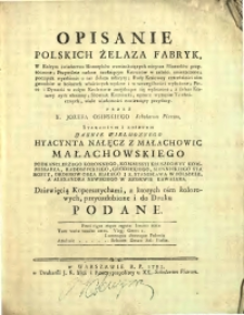 Title: Opisanie polskich żelaza fabryk, w którym świadectwa Historyków wzmiankujących miejsca Minerałów przytoczone ; Przywileie nadane szukającym Kruszców w całości umieszczone ; początek wyrabiania u nas żelaza odkryty ; Rudy Kraiowey czterdzieści ośm gatunków w kolorach właściwych wydane i w szczególności wyłożone ; Piece i Dymarki w całym Krolestwie znayduiące się wyliczone ; z żelaza Kraiowy zysk okazany ; Słownik Kuźniacki, oprócz wyrazów Technicznych, wiele wiadomości zawierający przydany
